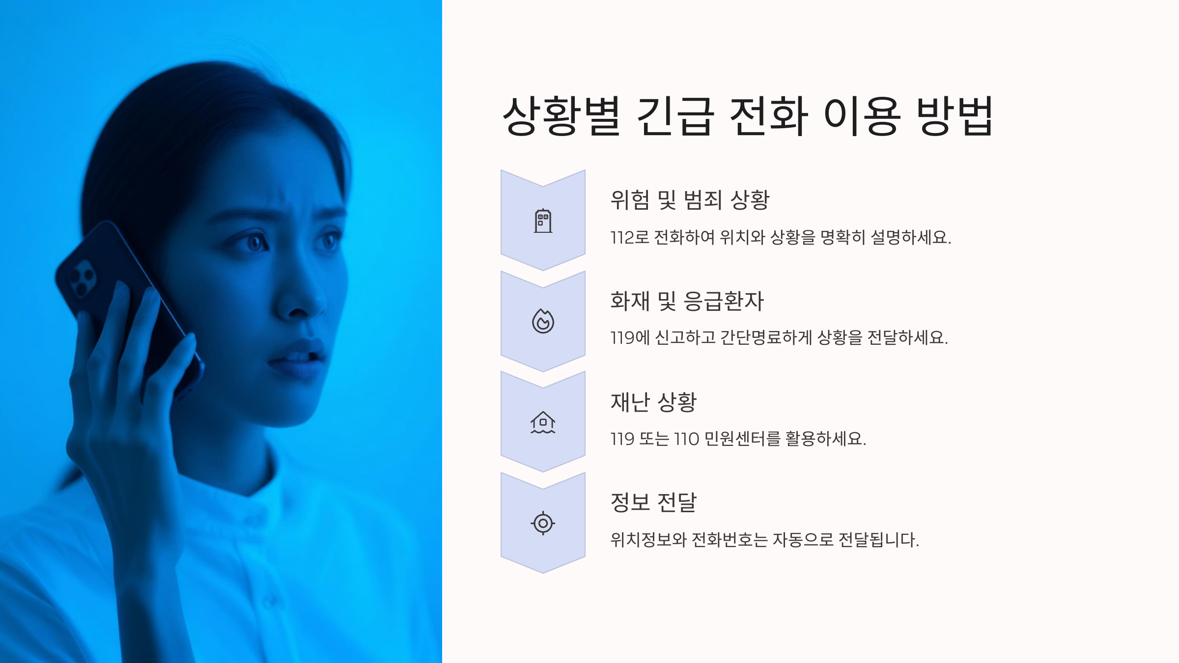 긴급 전화는 평소엔 사용하지 않다가, 갑작스럽게 필요할 때 당황하기 쉬워요. 그래서 상황별로 어떤 번호에 전화해야 하는지, 전화를 걸었을 때는 어떤 정보를 말해야 하는지 미리 알아두는 게 정말 중요해요! 👀