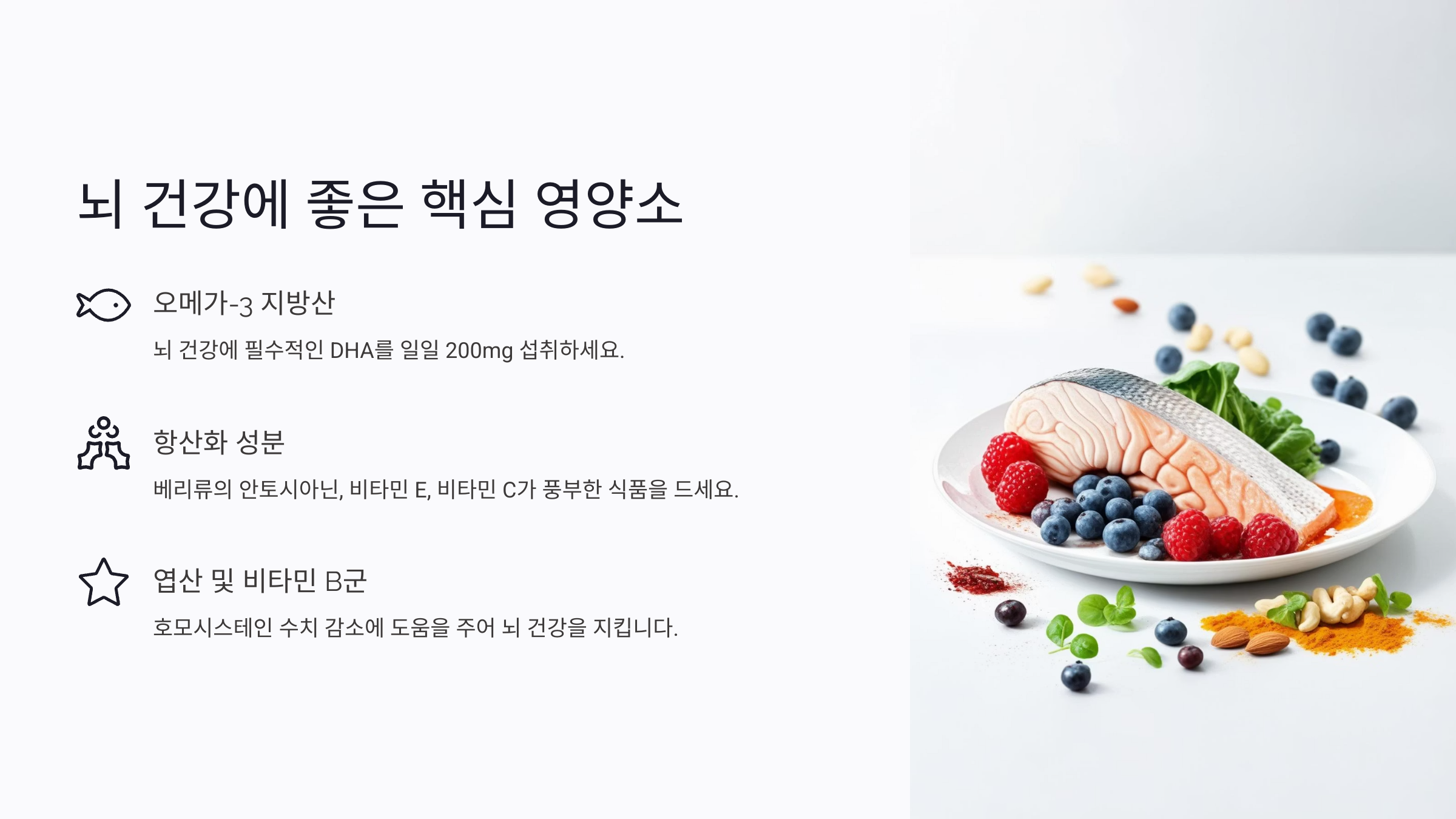 | DHA / EPA | 기억력 유지, 뇌 구조 보호 | 연어, 고등어, 참치 |