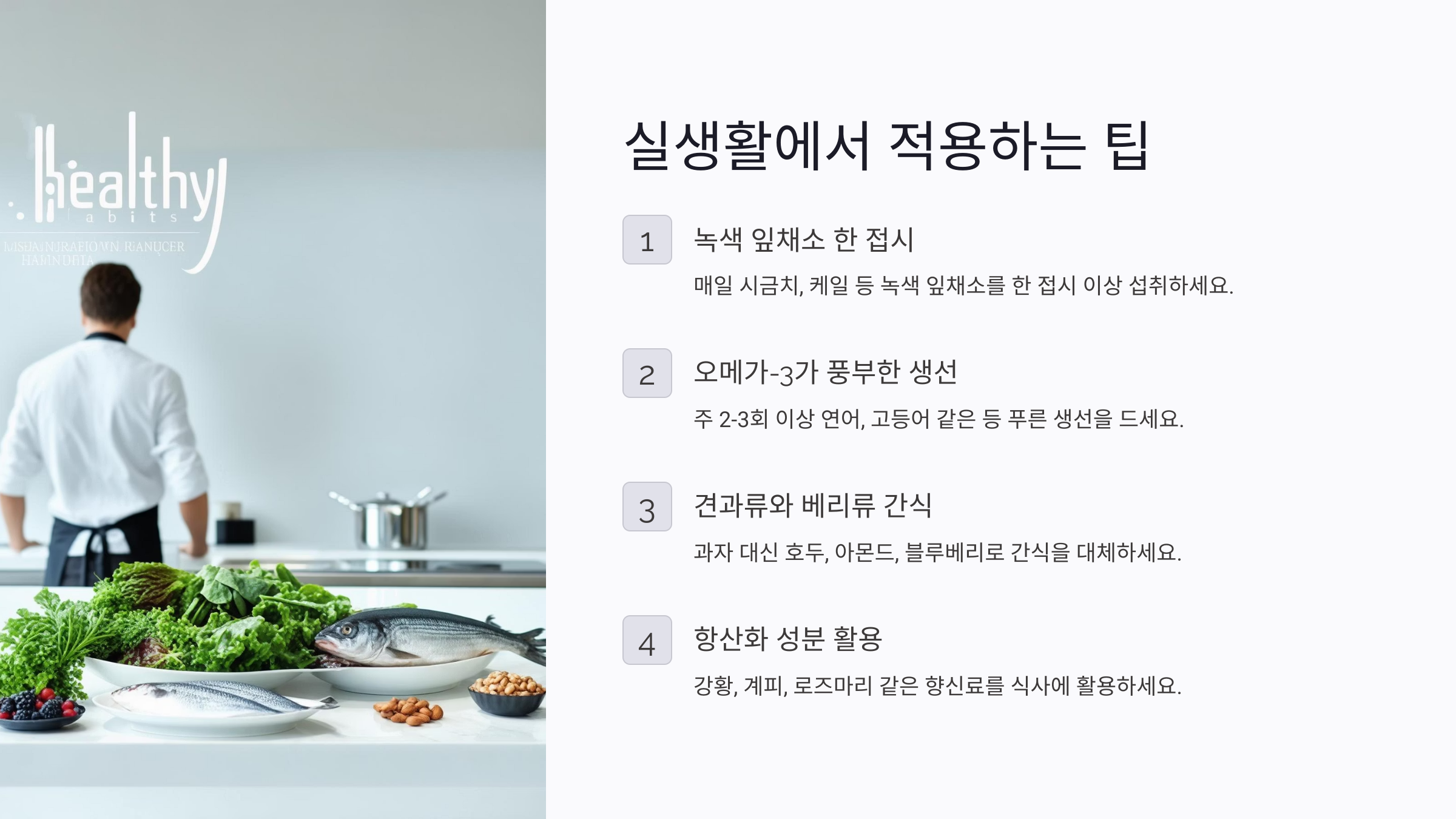 이 식단의 핵심은 ‘좋은 음식 10가지’와 ‘피해야 할 음식 5가지’를 분명히 나눈다는 점이에요. 채소, 견과류, 통곡물, 생선, 올리브유 같은 항산화 식품은 매일 섭취하고, 버터, 치즈, 패스트푸드, 튀김, 붉은 고기 등은 되도록 자제하는 방식이죠.